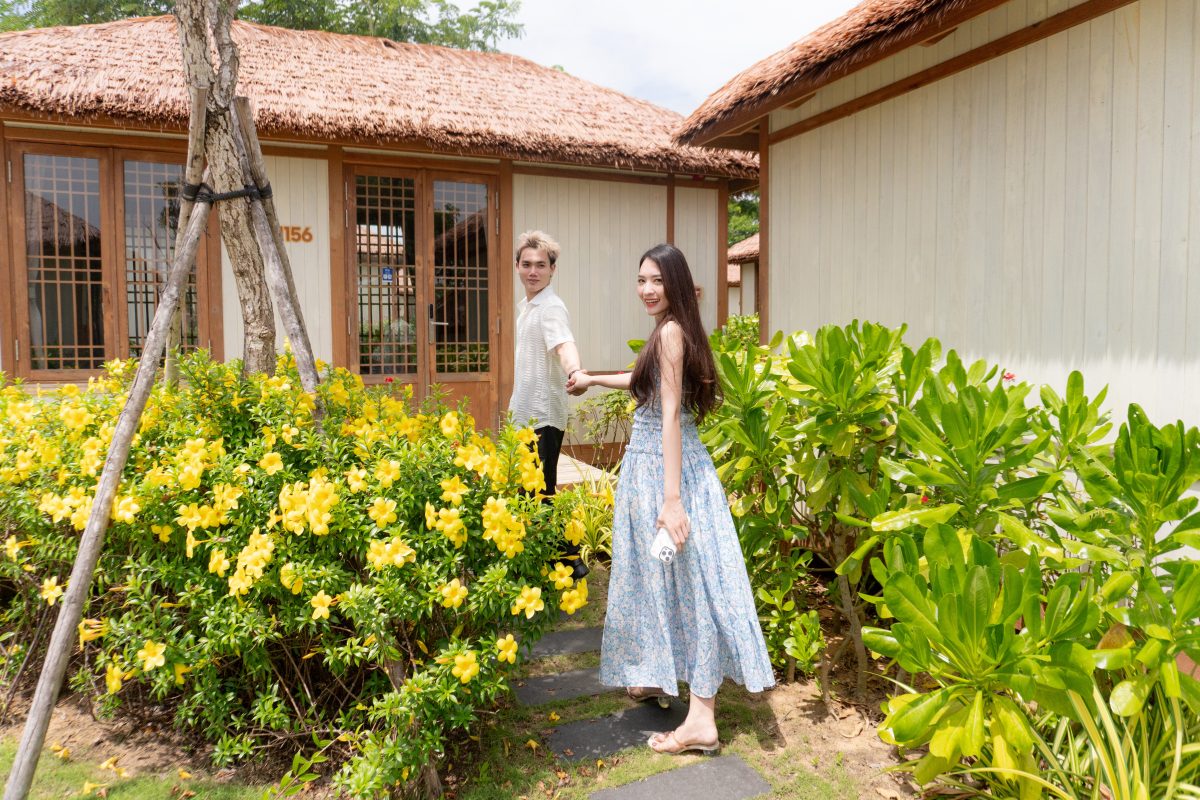 Những mái nhà lá cổ xưa, những căn nhà gỗ Hanok thấp thoáng bên biển, con đường sỏi đá và khu vườn xanh mát phủ bóng – tất cả hòa quyện tạo nên một không gian lưu trú giàu cảm xúc, nơi văn hóa hai vùng đất gặp gỡ và giao hòa một cách tự nhiên.